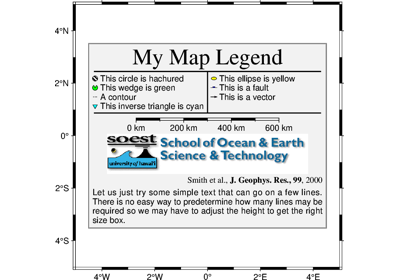 Makes legends that can be overlaid on maps. Reads specific legend-related information from an input file, or automatically creates legend entries from plotted symbols that have labels. Unless otherwise noted, annotations will be made using the primary annotation font and size in effect (i.e., FONT_ANNOT_PRIMARY).